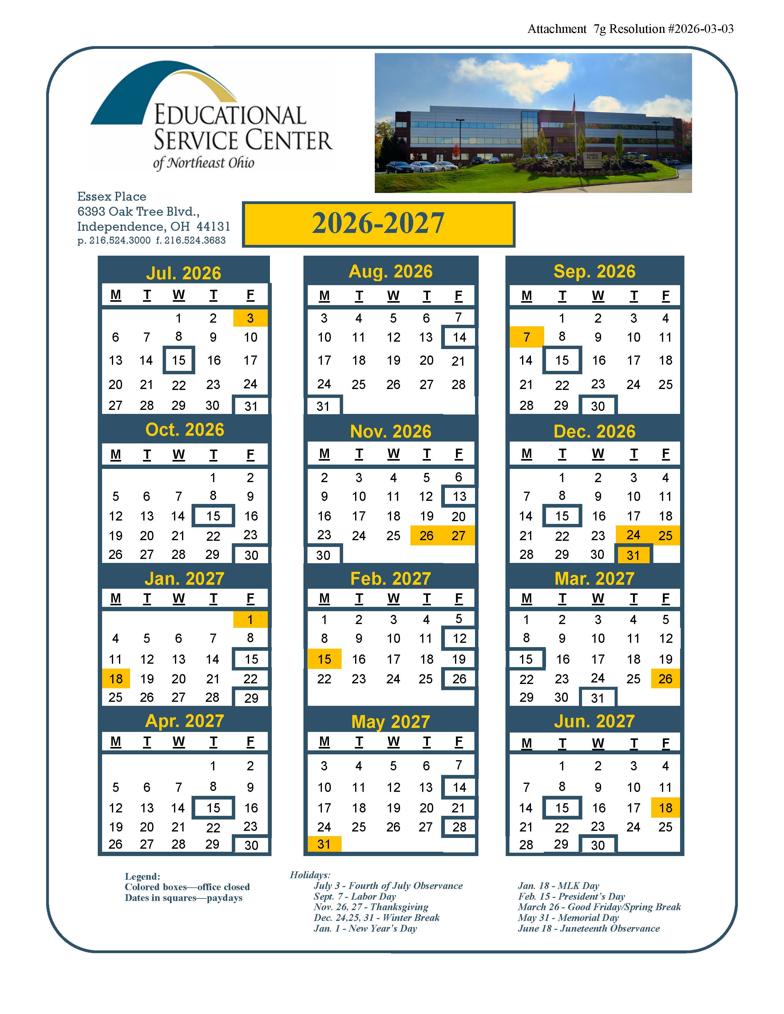 2026-2027 ESC Office Calendar