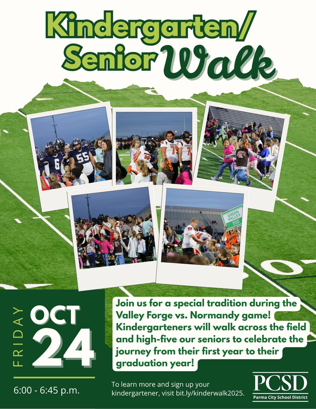 efore the Valley Forge vs. Normandy football game kicks off on Friday, October 24, Parma City School District will celebrate a heartwarming tradition that brings the school experience full circle — the annual Kindergarten/Senior Walk at Byers Field.