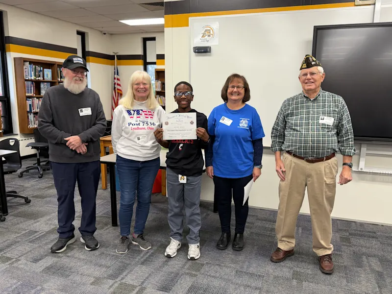 Seventh grader Raevenel Johnson received first place in the contest and his essay will be forwarded to District 7 to continue on in the competition. He received a Youth Essay Award, a $100 prize check, and a VFW auxiliary pin in recognition of his achievement.